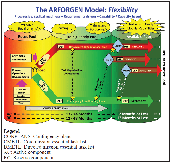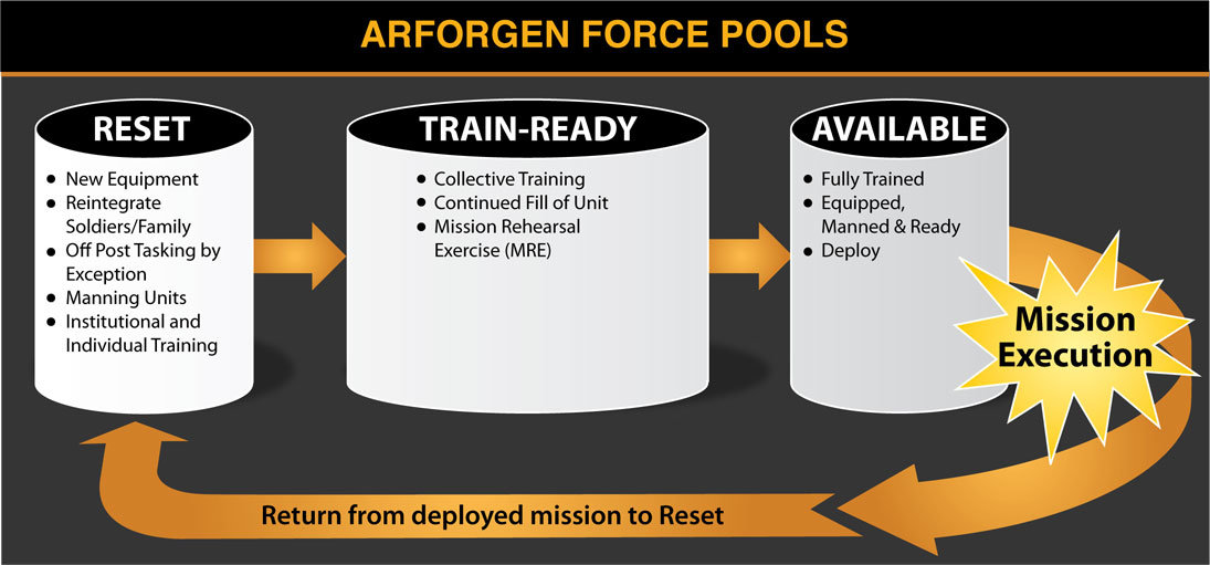 The acronym ARFORGEN stands for Army Force Generation. ARFORGEN was the “process of structured progression of unit readiness over time to produce trained, ready, and cohesive units prepared for operational deployment” in support of the Army’s requirements. The ARFORGEN process was first conceived in 2004 and formally adopted in 2006 as the Army’s mechanism for aligning its modular-brigade-centric strategy against the enormous mission requirements of the time for the most effective sustainment of its capabilities and mission success. That was a long sentence. More succinctly, ARFORGEN is about establishing organizational capabilities within a prescribed time period and validating total organizational effectiveness on a gated audit schedule.