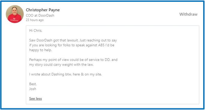 In case you don’t know, I wrote a whole long piece about DooDashing awhile back. I predicted DoorDash was gonna get sued. If you’re interested in my fuller thoughts on AB5 they’re way towards the last section of it.