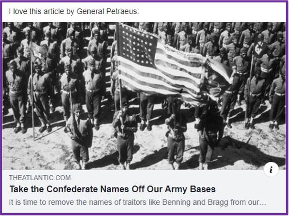 I shared with him in my comments the same sentiments I have with many others over the years: from when I joined the Army in 1998 through 18 years serving our country it always boggled my mind that we ever allowed confederate homage on any of our bases, just the same as we wouldn’t name them “Fort Hitler” or “Fort George III.” It’s always been bass ackwards, I guess better late than never that we’re finally gonna get it fixed now.