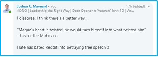 There’s hate all over Reddit that goes in all directions, not just the threads they’ve purged. To me this is just virtue signaling Reddit has sold out, bated by social currency into betraying free speech.