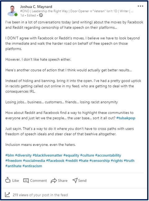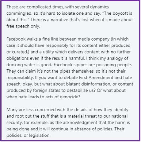 I want to support Color of Change, and stopping hate for profit, but I don’t agree with their demands on FB. I’m glad they’re getting headlines for their cause, but this is unrealistic scapegoating of Facebook for PR. Taking action against racist, violent, and verifiably false content is basically a war against Facebook’s core product: Americans’ hot air.