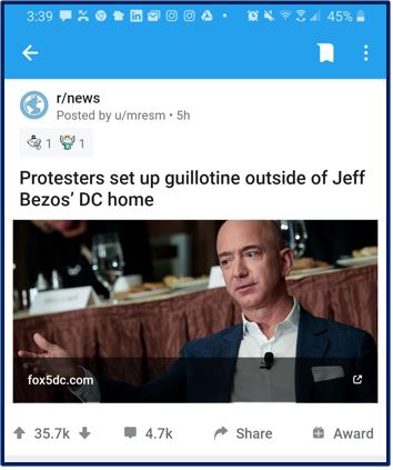 It’s news right? But 37.5K people like it on Reddit (at least), enough that the app promoted it via notification to me. Should we behead Jeff Bezos but ignore Donald Trump? Isn’t this story you’re promoting a form of hate toward an identity or vulnerability?
