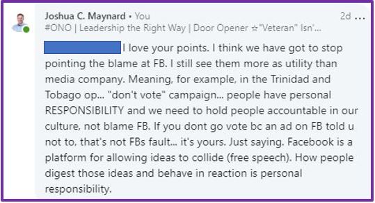 If there’s ANY chance of bridging gaps to reign in extreme hate and racism we have to have forums for very uncomfortable discussions between polar opposites ideologies. We’ve gotta cut through stereotype and resentful perspectives of the ugliest kind. It’s probably actually SAFER to try and have the dialogue online rather than in person for many folks, which is a capability that Facebook brings to the most people on earth of any other app.